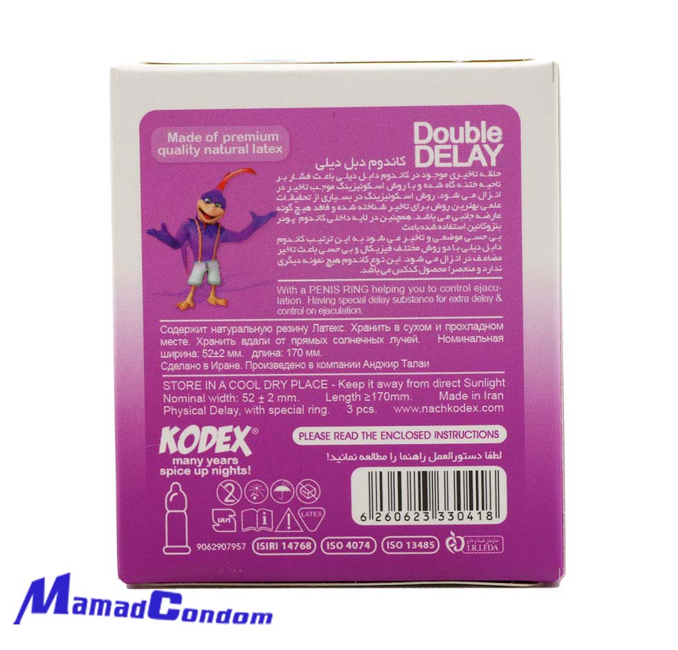 کاندوم تاخیری کدکس مدل دبل دیلی Nach Kodex Double Delay با حلقه تاخیری باعث فشار بر ناحیه ختنه گاه شده و با روش اسکونیزینگ موجب تاخیر در انزال می شود. روش اسکونیزینگ در بسیاری از تحقیقات علمی بهترین روش برای برای تاخیر شناخته شده و فاقد هیچ گونه عارضه جانبی می باشد.